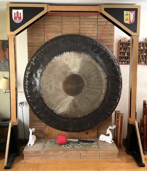 This special instrument is a one-of-a-kind gong crafted to my specification by Herr Broder Oetken of Fokbek, Germany. He is a master gong maker who once worked for Paiste, but now creates world-class gongs under his own name. This gong is a 200 pound nickel-silver 'symphonic' gong, and has to be heard in person to appreciate its power and complexity. It is suspended on a stand I designed and constructed.